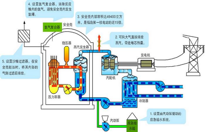 1.堆芯不會失去冷卻。機組即使失去全部廠內外電源,也能通過自帶的氣動給水泵和蒸汽排放的形式維持對堆芯的冷卻。此外,還額外設置第五臺柴油機,全廠失電的風險進一步降低。