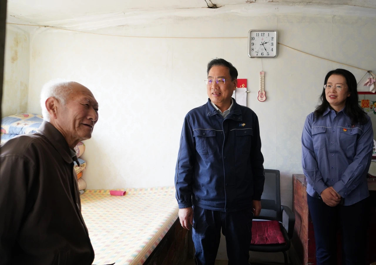 在溝口村李西屯82歲李明才老人家中,一進屋就看到衣柜上擺著公司2013年為老兩口拍攝的金婚照。老人指著照片說:“這就是你們核電拍的,10年了,你們看我變化大嗎?”張衛東打趣道:“100歲的時候,我們還給你們拍。”在與老人交流中,張衛東得知老人年輕時當了8年兵,也是一位有50多年黨齡的老黨員,不由得為老人家豎起拇指。李明才老人非常自豪地向大家展示自己“光榮在黨50年”勛章。張衛東希望老兩口能繼續保持樂觀心態,笑口常開,并送上了節日的祝福。
